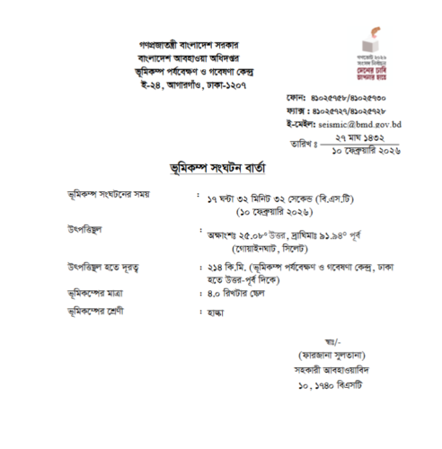 সহকারী আবহাওয়াবিদ ফারজানা সুলতানা সই করা বিজ্ঞপ্তিতে বলা হয়, বিকাল ৫টা ৩২ মিনিট ৩২ সেকেন্ড ভূমিকম্পটি হয়।